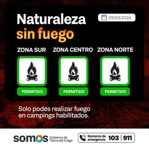 El Gobierno de Tierra del Fuego informó que para este 9 de marzo de 2026 el índice de peligrosidad de incendios permite hacer fuego únicamente en campings habilitados en las ciudades de Río Grande, Tolhuin y Ushuaia.